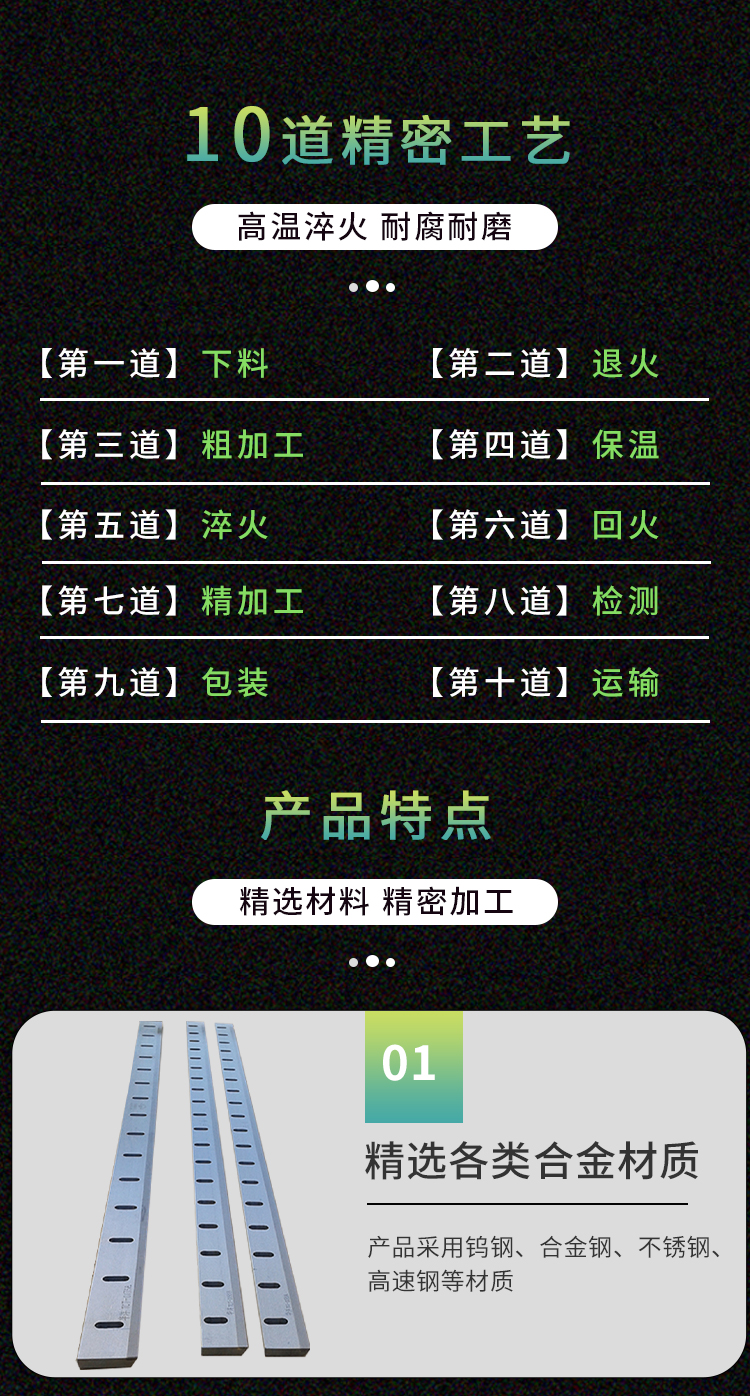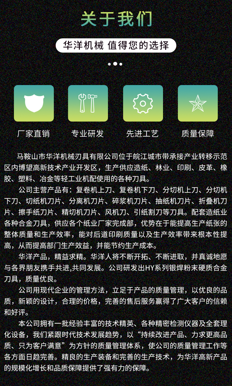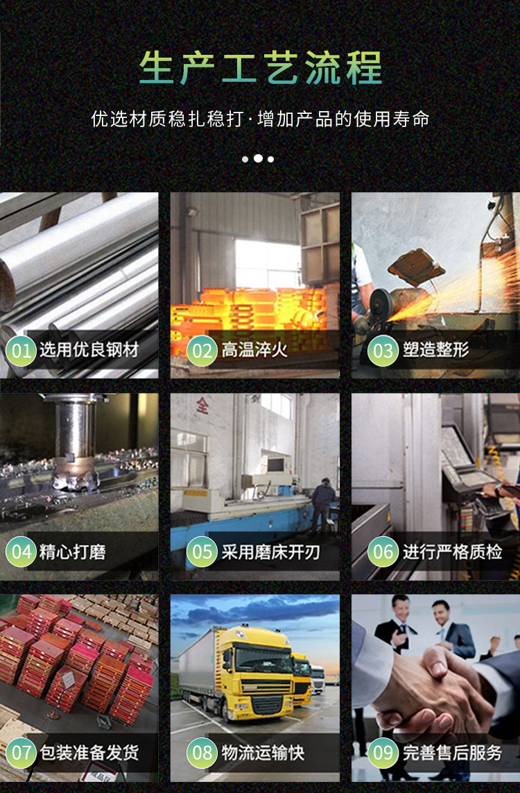 我公司生產(chǎn)的HY系列分切機(jī)刀片采用9CrSi、D2、SKD-11、Cr12MoV、H13、SKH-51、W6Mo5Cr4V2、W1Cr4V等優(yōu)良材質(zhì),并經(jīng)過一系列數(shù)控加工工藝加工,有效保障了刀片的質(zhì)量和精度。